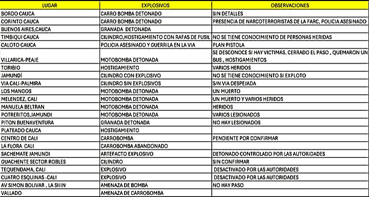 El primer caso se presentó el lunes 9 de junio en Jamundí, Valle del Cauca. Los demás hostigamientos y activaciones de explosivos en contra de la población civil y la Fuerza Pública fueron el martes 10 de junio de 2025, entre las 3:22 a.m. y 8:30 a.m. en Cali, Jamundí, Palmira y Buenaventura, Valle del Cauca, y en los municipios de El Bordo, Corinto, Timbiquí, Toribío, Morales, Buenos Aires, Villa Rica y Caloto, Cauca.