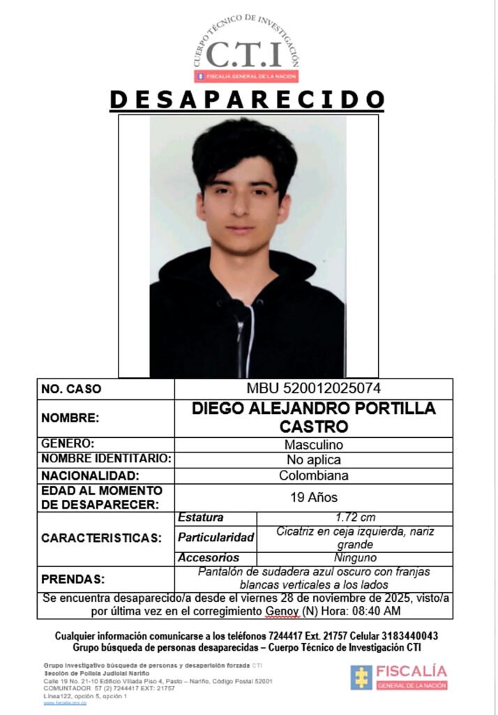 La familia de Diego Alejandro Portilla Castro, de 19 años de edad, lo busca de forma angustiosa desde el 28 de noviembre, cuando fue reportada su desaparición, cuando fue visto en una de las calles del corregimiento de Genoy, al occidente del casco urbano de Pasto.